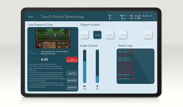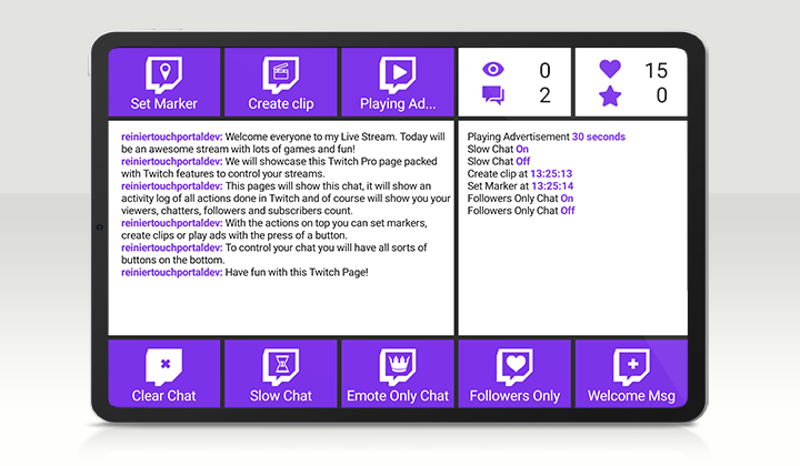 Our users have made Pages for Twitch which you can download and import into Touch Portal to have a full setup right away. Even if they do not fit your wishes fully you can still use these as the base of your own customized setup. Most pages exceed the 4x2 size and thus require the Pro Upgrade to use.
