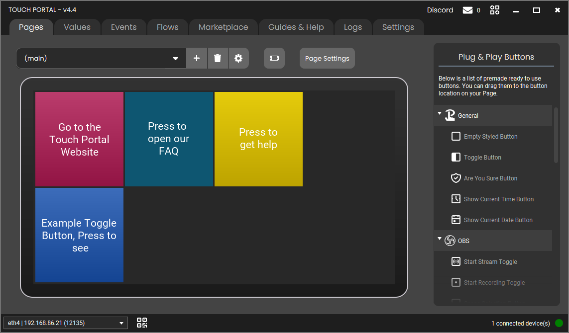 Touch Portal sections such as Pages, Events, Flows, Values, the Marketplace, Guides and Help and the Touch Portal logs.