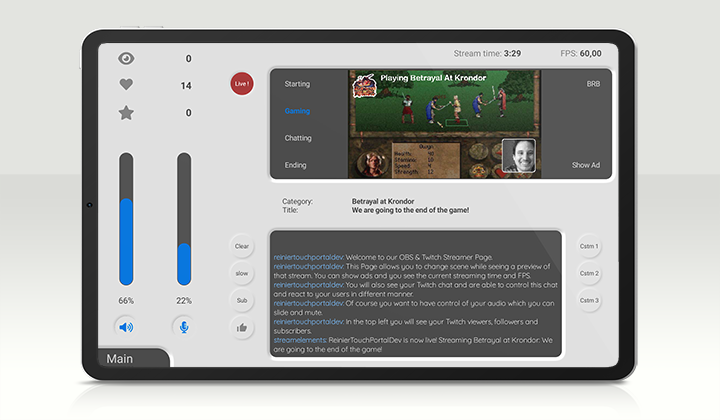 This Twitch Page for the Free base version of Touch Portal allows you to control Twitch. See your chat, control your chat, see your viewers, followers and subscribers, start ads and create clips.