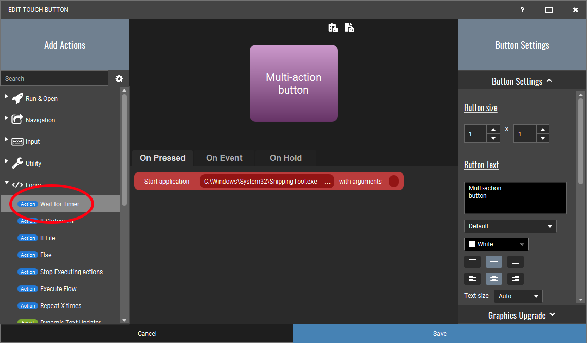 This is also a good moment to explain a bit on the action flow of a button. When you add actions in the list of the ON PRESS category, they will be executed in order. This means the first action will be triggered and when this has been done, the second will be executed and so on. Do understand that the action is executed but it does not wait for any result. In our case it has triggered the start of the snipping tool application and continues on to the next action in the queue. It does not wait for the application to actually be fully started. This is why we need the timer for this in our current button, let's add it: